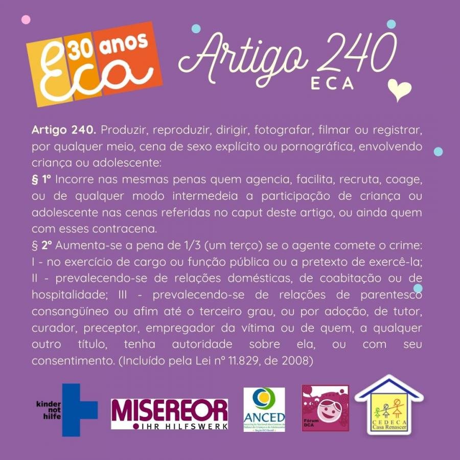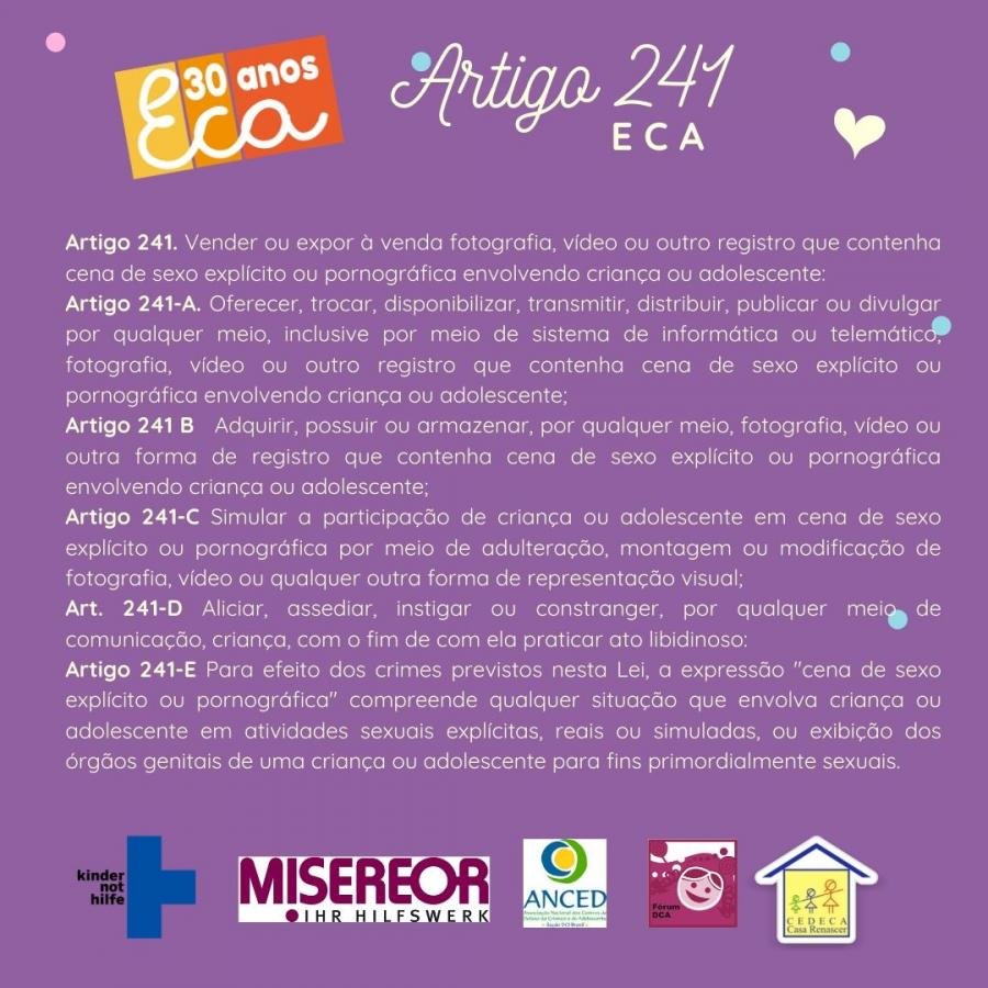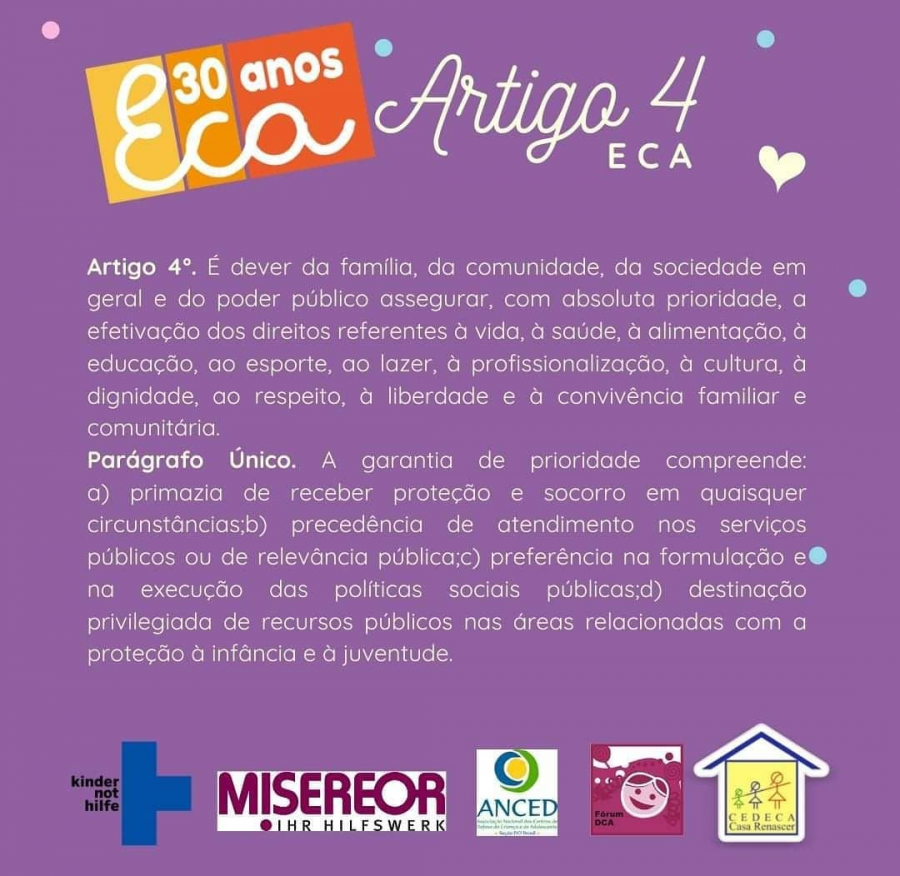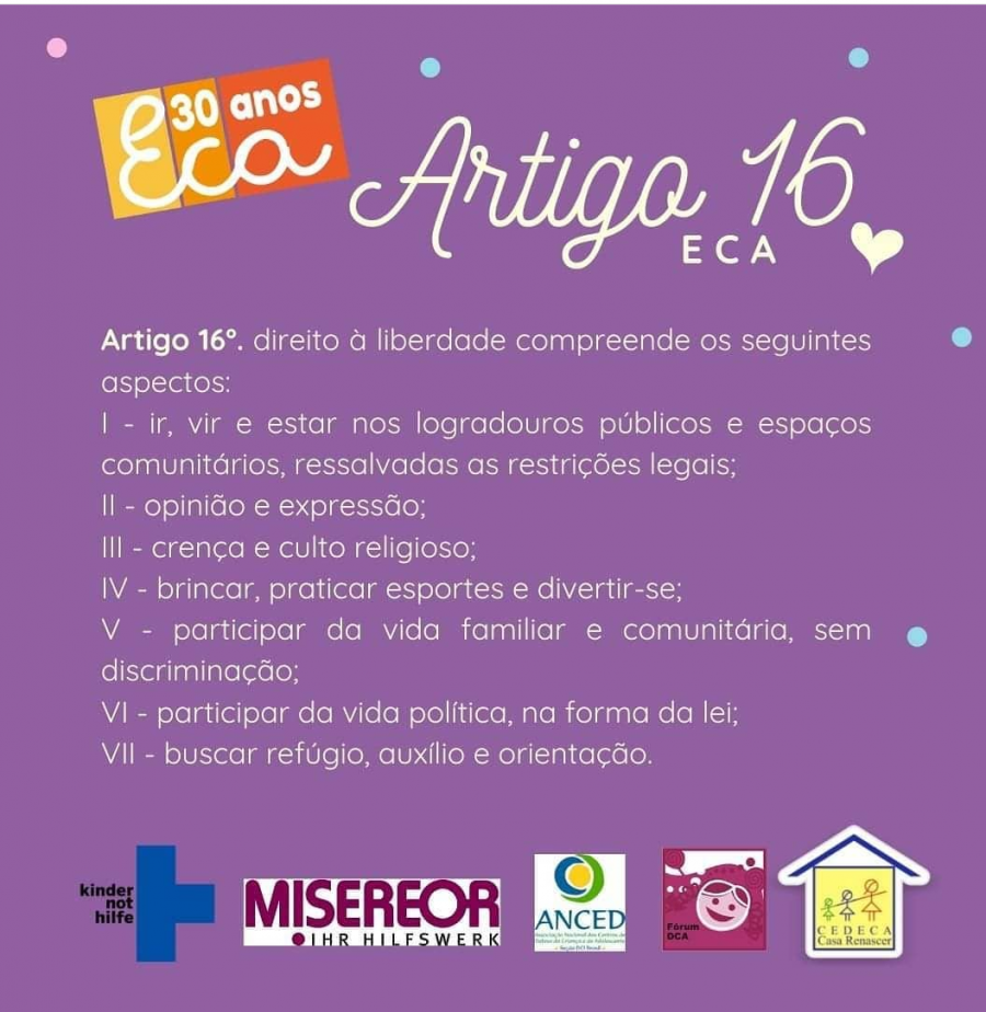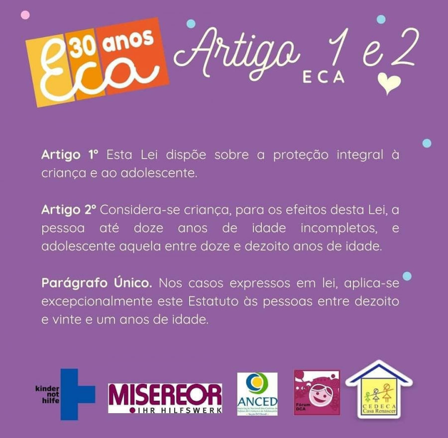 O Estatuto da Criança e do Adolescente, considerado uma das legislações mais avançadas do mundo que dispõe sobre a proteção integral dos direitos de crianças e adolescentes vai completar 30 anos, próximo dia 13 de julho. Para celebrar esse momento reunimos alguns artigos dessa lei tão importante na efetivação da cidadania no país em cards educativos.