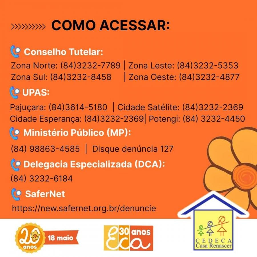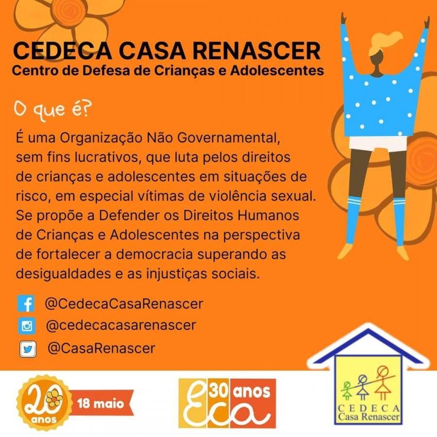 Pensando em melhorar o fluxo de atendimentos, nesse momento de isolamento social em decorrência da pandemia do COVID-19, o CEDECA Casa Renascer, através da Assessora Jurídica, do Serviço Social, Psicologia juntamente com Atores Sociais e demais Instituições participantes da Rede de Proteção e apoio à Crianças e Adolescentes vítimas de violação de direitos, construiram esse conteúdo em cards para facilitar e referenciar a busca por atendimento em caso de violência sexual em Natal(RN).